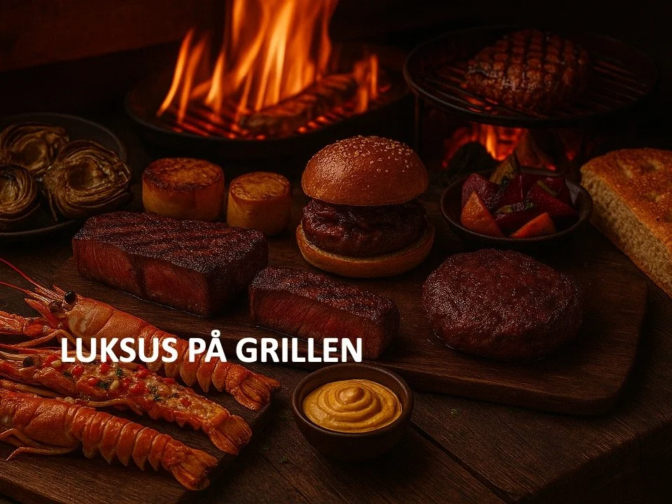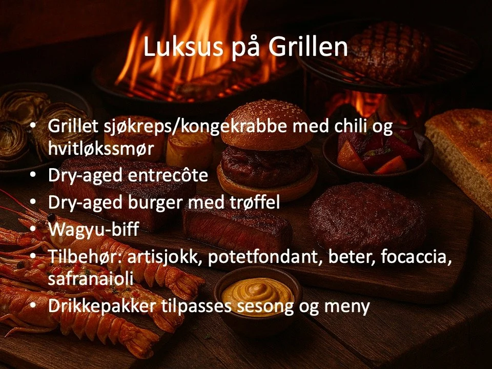 En luksuriøs meny for den som ønsker det aller beste fra grillen! Vi starter med delikat grillet sjøkreps eller kongekrabbe, glassert med chili og hvitløkssmør som gir en uimotståelig balanse mellom varme og fylde. Deretter følger et utvalg av møre kjøttklassikere – dry-aged entrecôte, trøffelburger og eksklusiv wagyu-biff, alle grillet til perfeksjon. Som tilbehør serveres kremet potetfondant, syrlige beter, grillet artisjokk, nystekt focaccia og en luksuriøs safranaioli. Vår vinekspert setter sammen drikkepakker som matcher hver rett – for en kveld fylt med smak, eleganse og ekte grillglede.